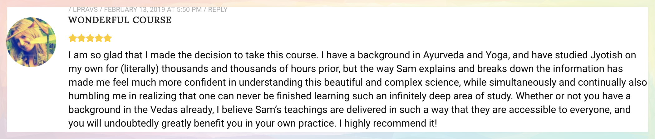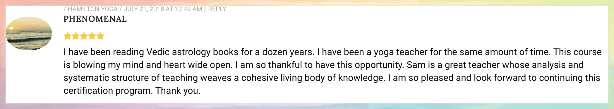 In addition, we start getting into planetary aspects and yogas. These two very important functional aspects of Vedic astrology begin to prepare us for actual chart analysis.