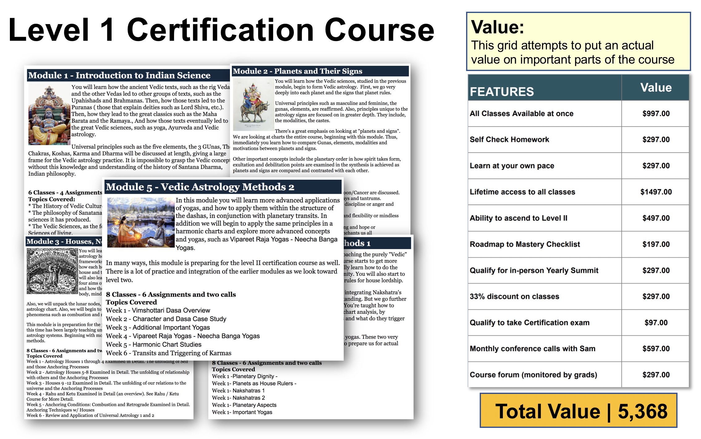 Only now that we begin approaching the purely "Vedic" methods. At this point the course starts to get more complicated as you will actually learn how to do the calculations for planetary dignity. You will also start to learn the complex and subtle rules for house lordship.Also, we spend several weeks integrating Nakshatra's into your astrological understanding. But we go further than just rote memorization. You're taught how to actually use a Nakshatra's in chart analysis, by redoubling our efforts on the deities of the Nakshatra's and what do they trigger in their dasa cycles.