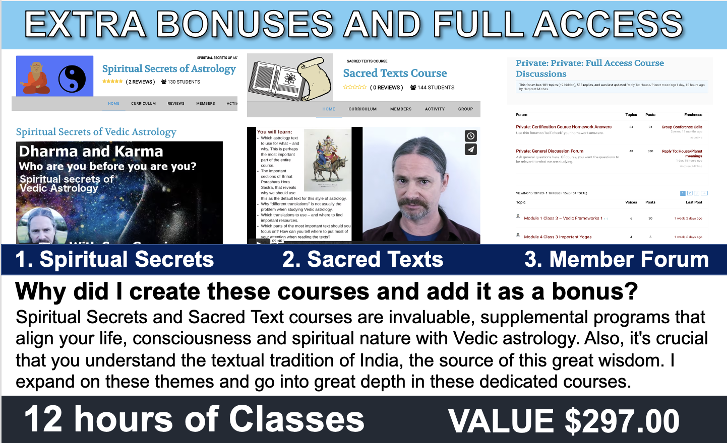 You will learn the secret power and connection in the astrology houses. You will learn several important frameworks such as how "one thing leads to another", how each house is the culmination of the previous house and the origin point of the following house. You will also learn the powerful frameworks related to the four aims of life: Dharma, Artha, Kama and Moksha - and how these lessons culminates and evolve through body, mind and spirit.Also, we will unpack the lunar nodes, and start to approach helps use them in the astrology chart. Also, we will begin to look at more important astronomical phenomena such as combustion and retrograde.